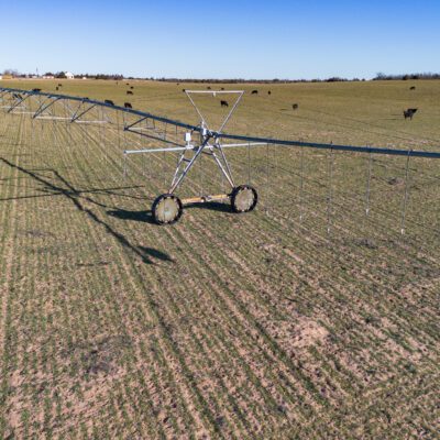 Irrigation is supported by three wells, with the west and south wells producing approximately 200 GPM each and the east well producing 100 GPM, all feeding a Zimmatic center pivot nozzled at 500 GPM. A stock tank is located at the center pivot. The ground is currently planted in wheat, with the east corners in grass and west corners in dryland.