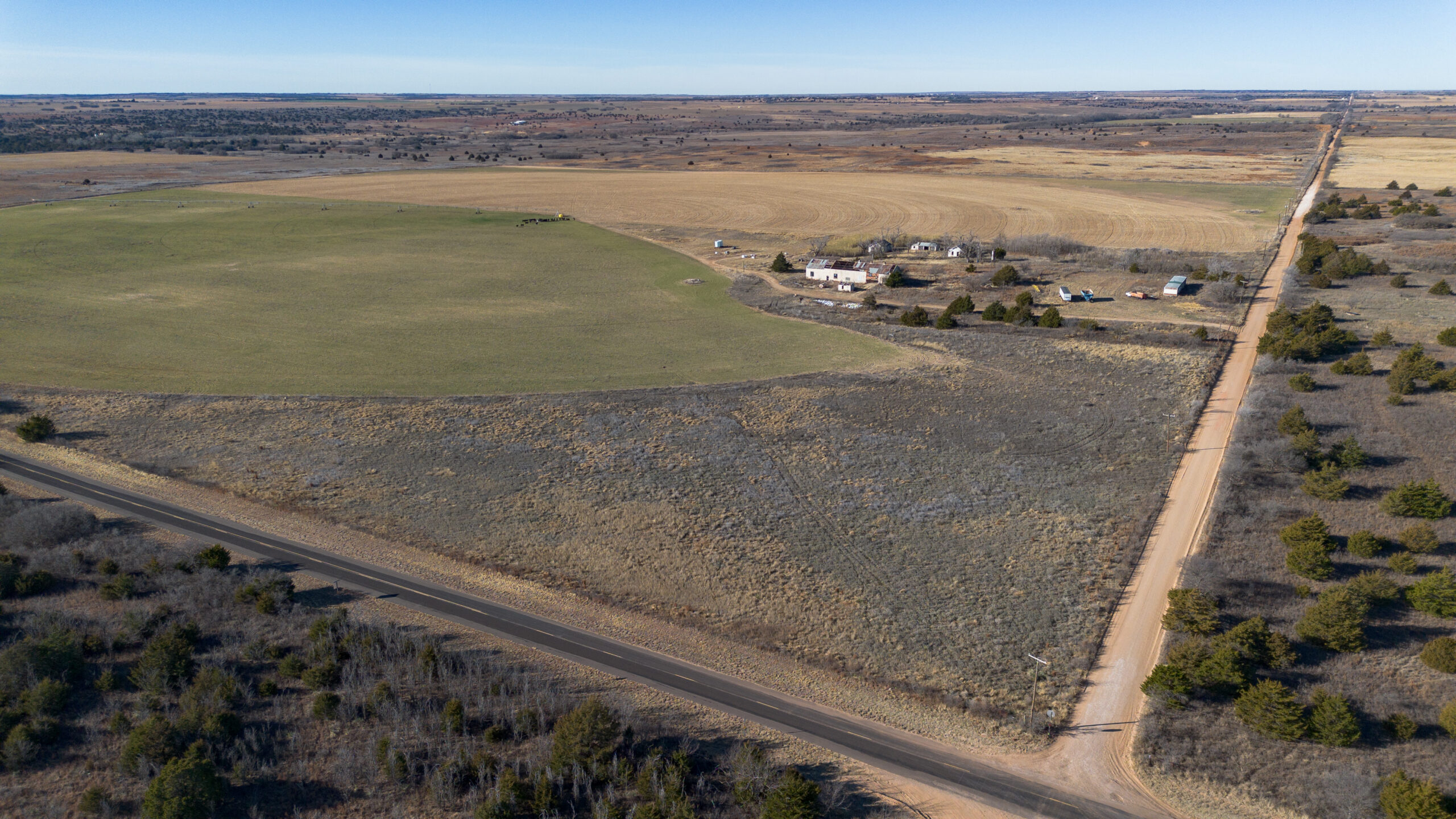 Perimeter fencing is in decent condition, and access is excellent with ½ mile of paved frontage and ½ mile of county road access on the north side, where the main gate is located. A small 10-acre lease area is excluded from the sale and currently leases for $250 annually. Wheeler County allows approximately 12 inches of water per year, and there are no water lines crossing the road.