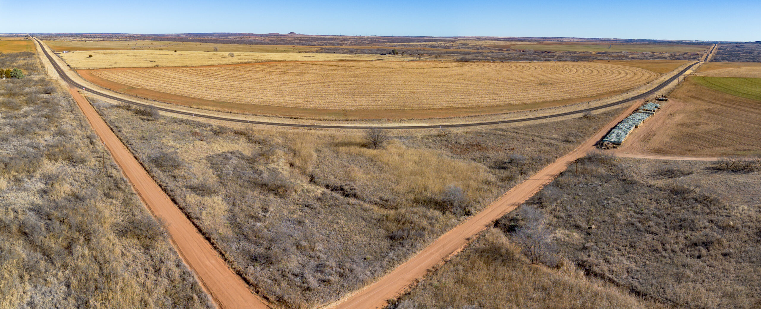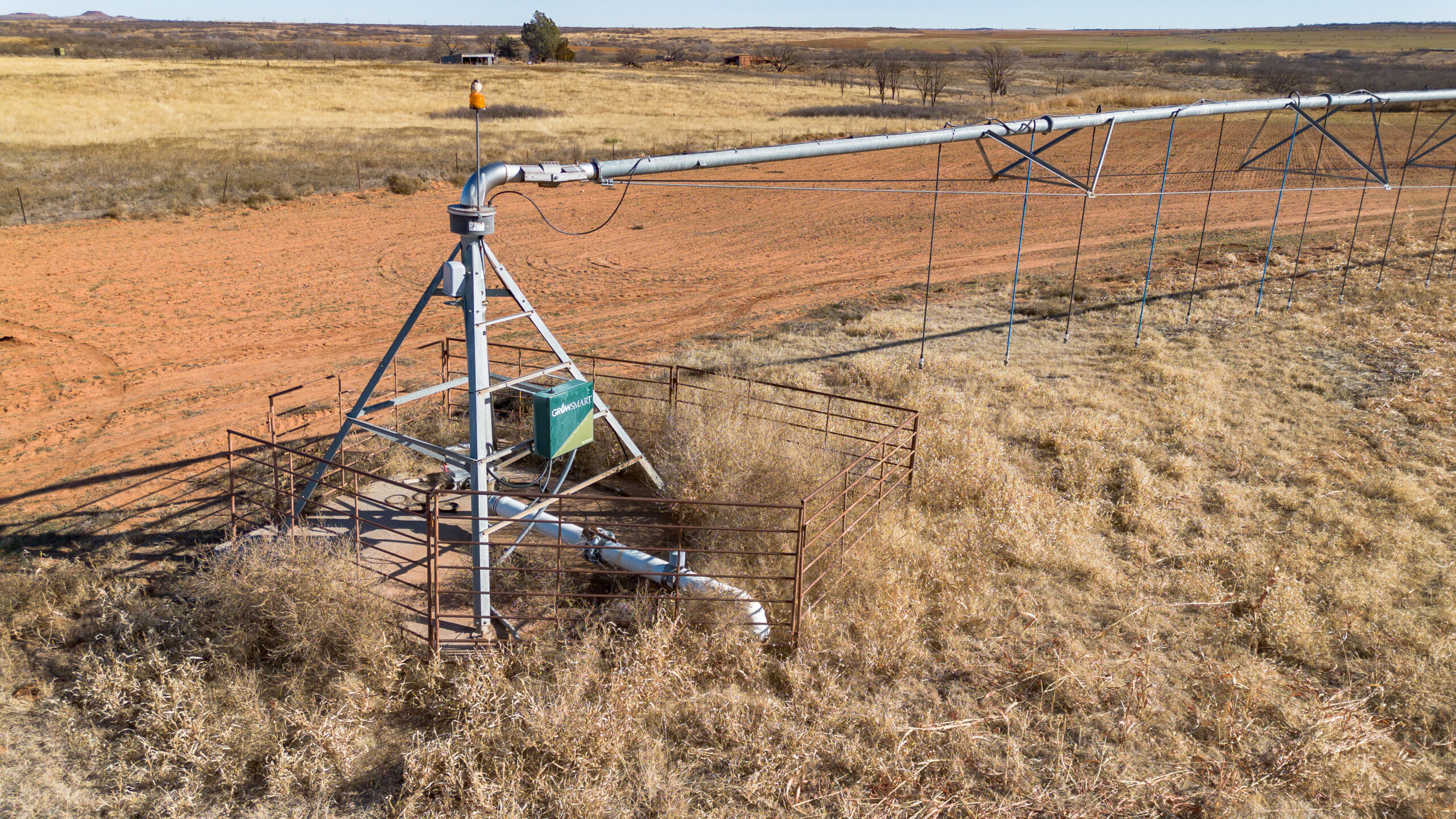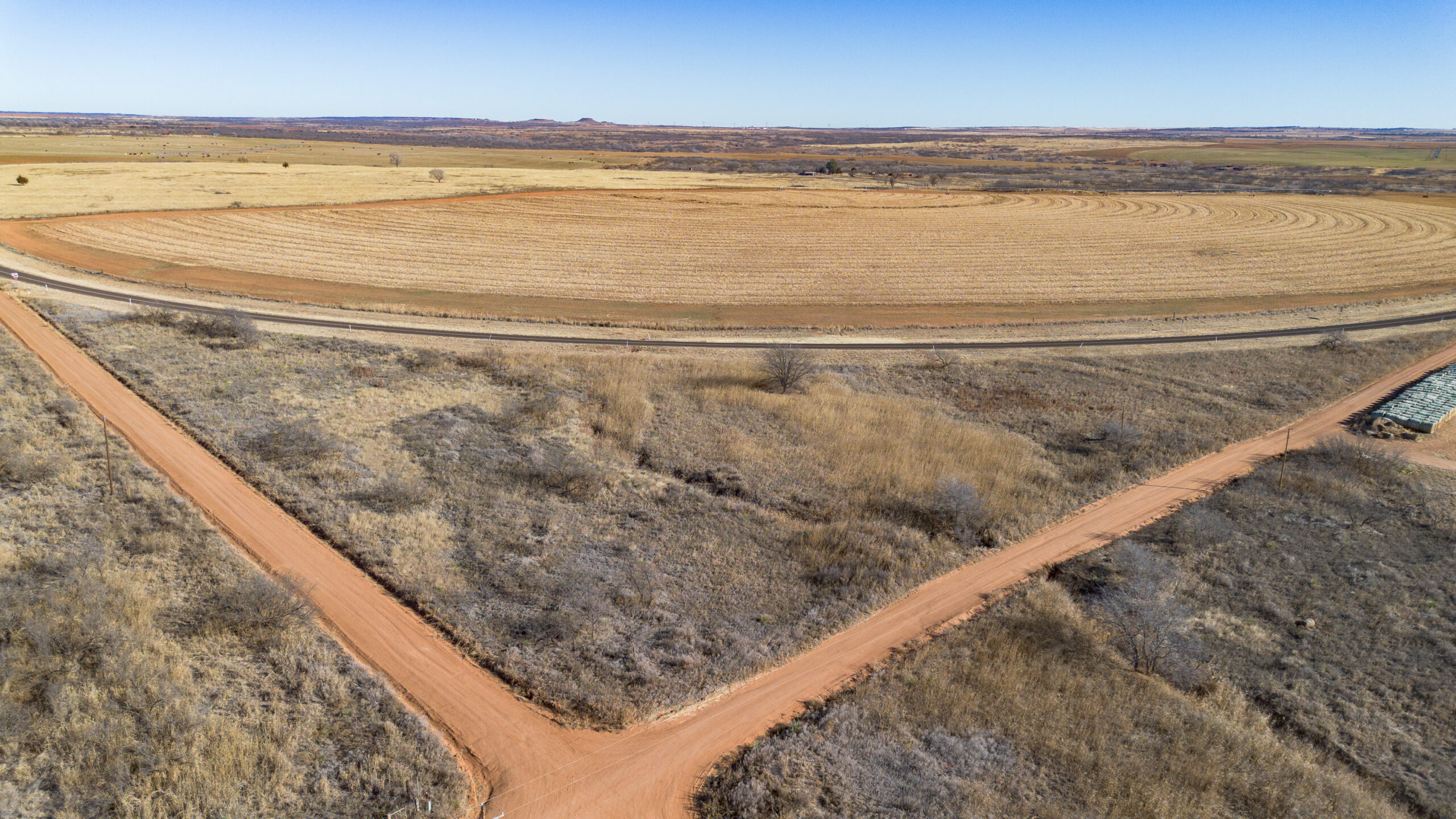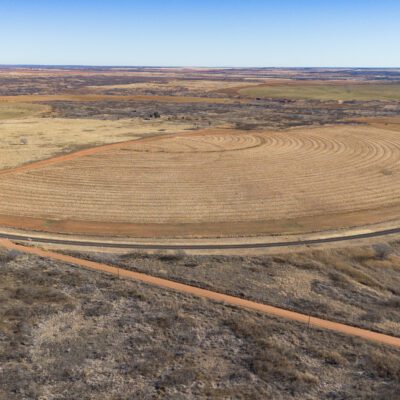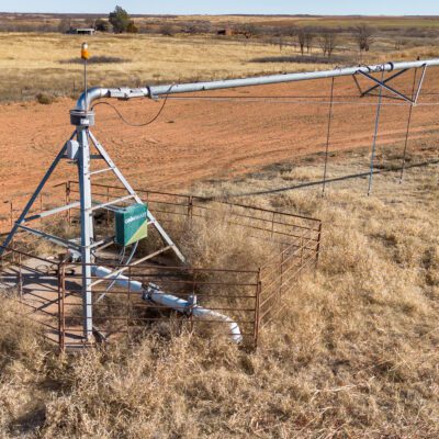 Improvements include one irrigation well and one domestic well, located side by side, both electric. Irrigation is handled by a Zimmatic center pivot nozzled at 450 GPM, with 3-phase electricity running through the property. Wells are approximately 140–150 feet deep.