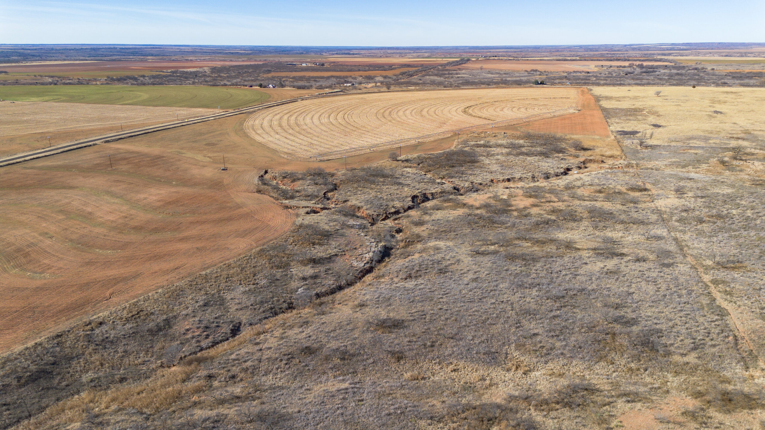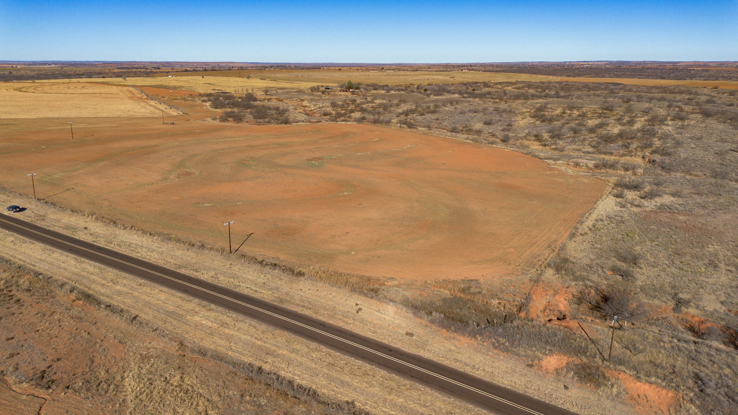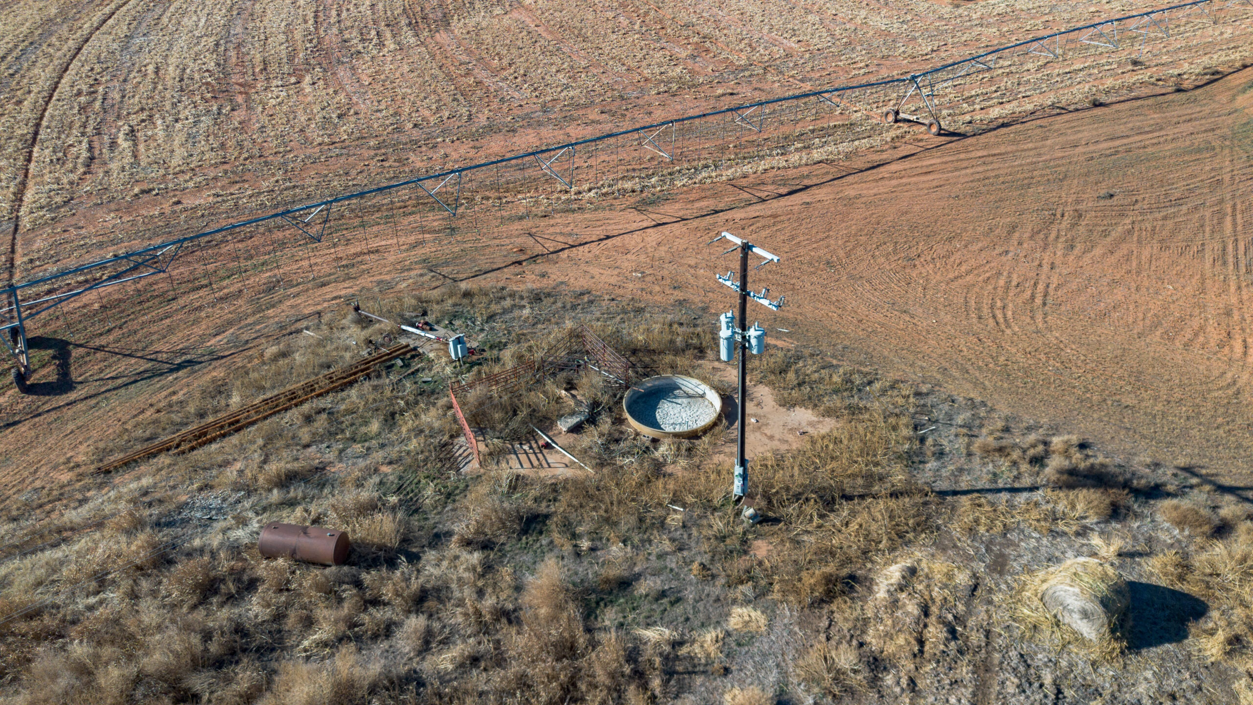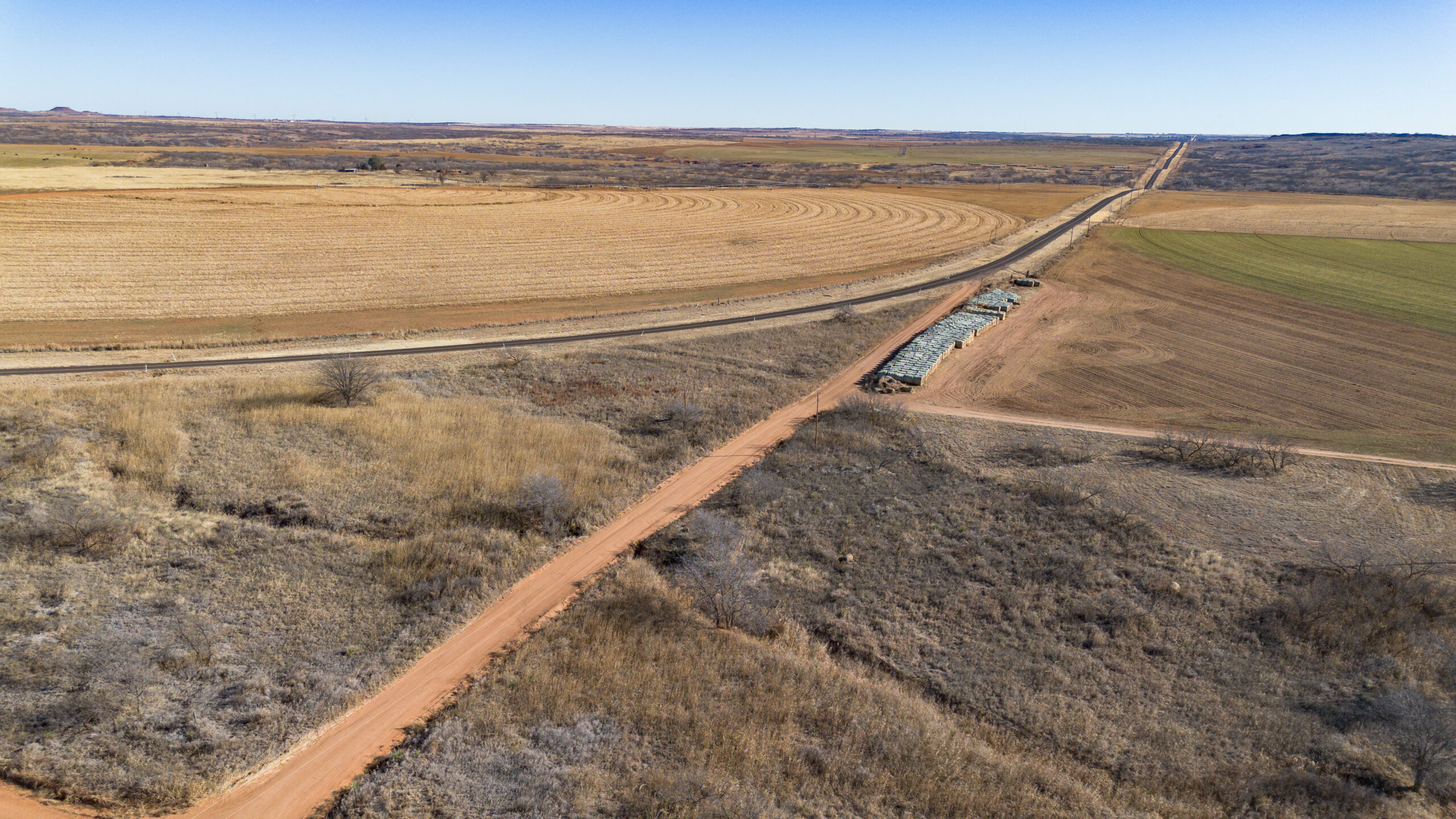 Improvements include one irrigation well and one domestic well, located side by side, both electric. Irrigation is handled by a Zimmatic center pivot nozzled at 450 GPM, with 3-phase electricity running through the property. Wells are approximately 140–150 feet deep.