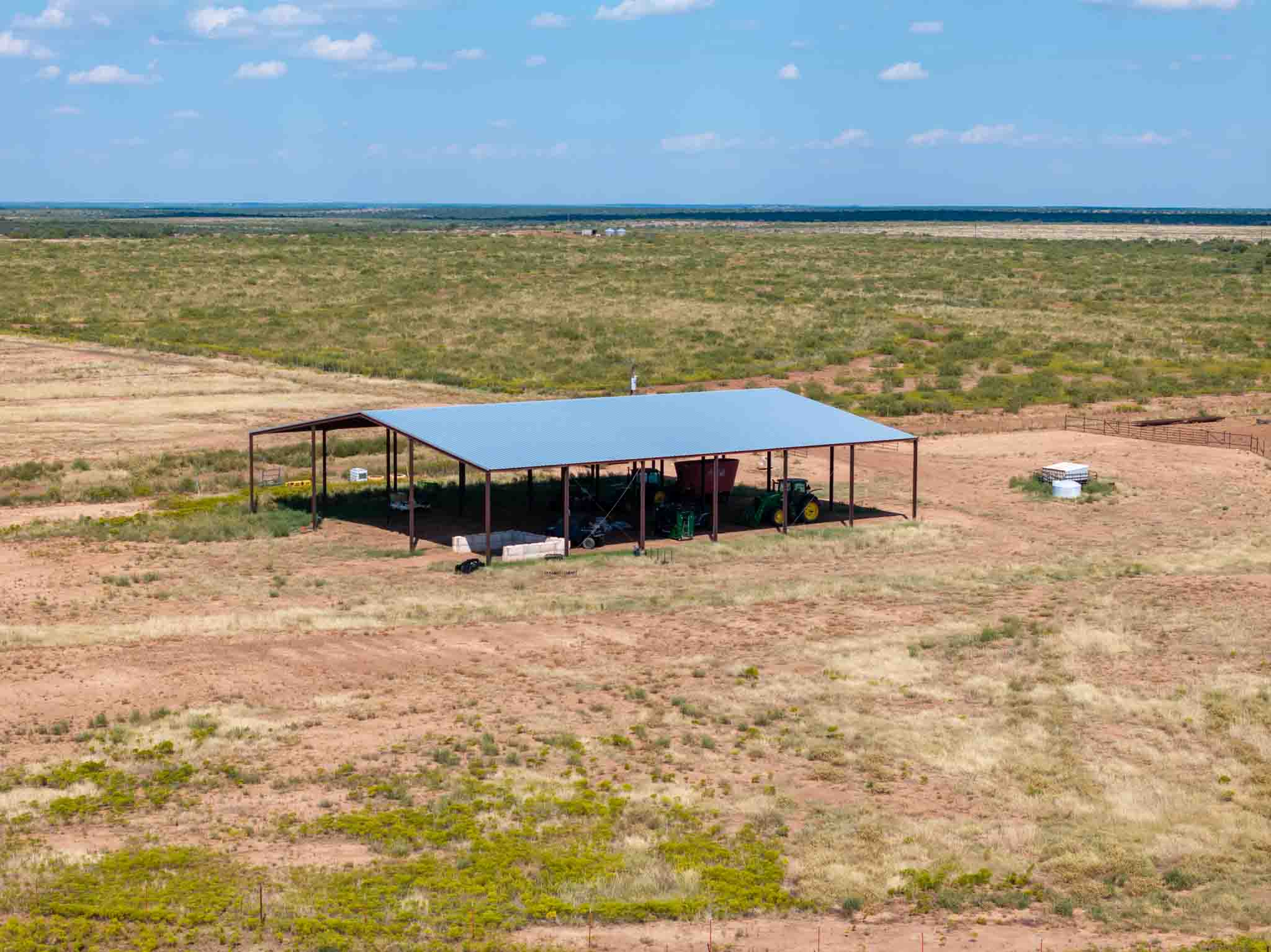 A large 100×125-foot I-beam hay barn offers excellent storage for equipment and feed, matched with a good set of working pens on the SE side of the farm. Over three miles of county road frontage provide convenient access from multiple directions, and the entire property is well-fenced and maintained.